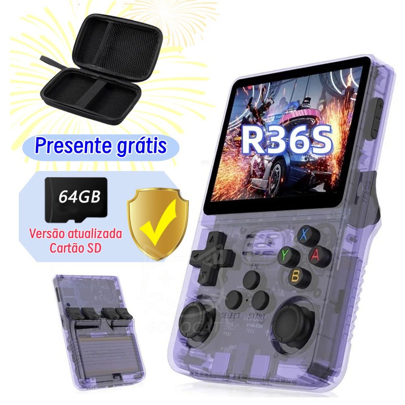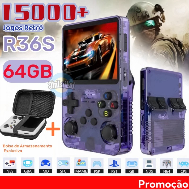 Console de Jogos Portátil R36S com mais de 15000 Jogos, Linux, 64GB, Tela IPS de 3.5 Polegadas, Pronta Entrega