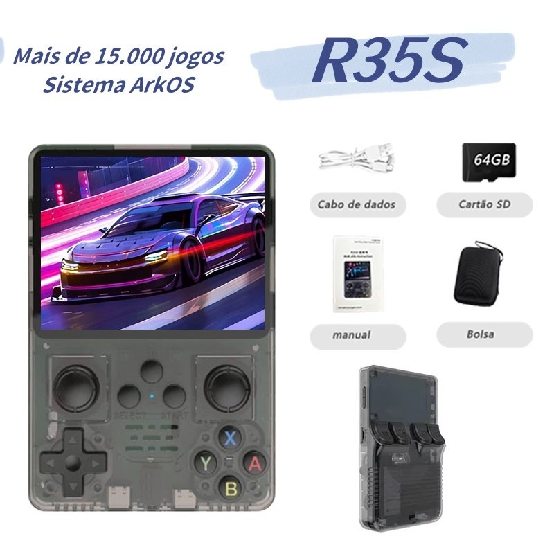 R35S de 15.000 Jogos 64GB, Vídeo Game Console Portátil, R36S Tela IPS 3.5 Polegadas - Envio Imediato