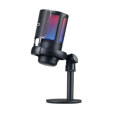 Microfone Condensador com Mudo Rápido, com Controle RGB Captação Dinâmica Supercardioide, Conexão USB Plug and Play para Gravação de Conteúdo e Streaming em PC e Mac, Conector para fone ouvido - Preto