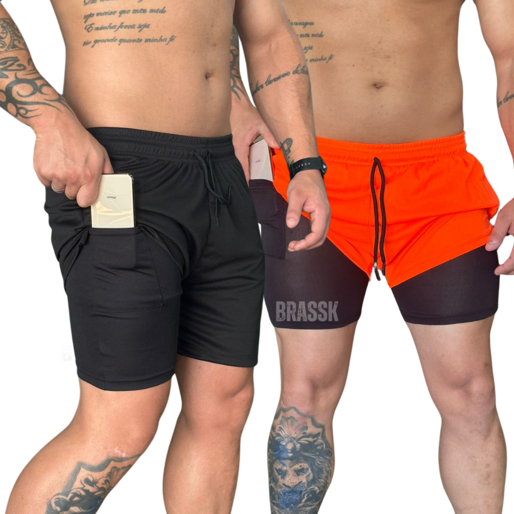 KIT 2 Short BRAS 2 em 1 Bermuda Elastano Academia Masculina Treino Corrida