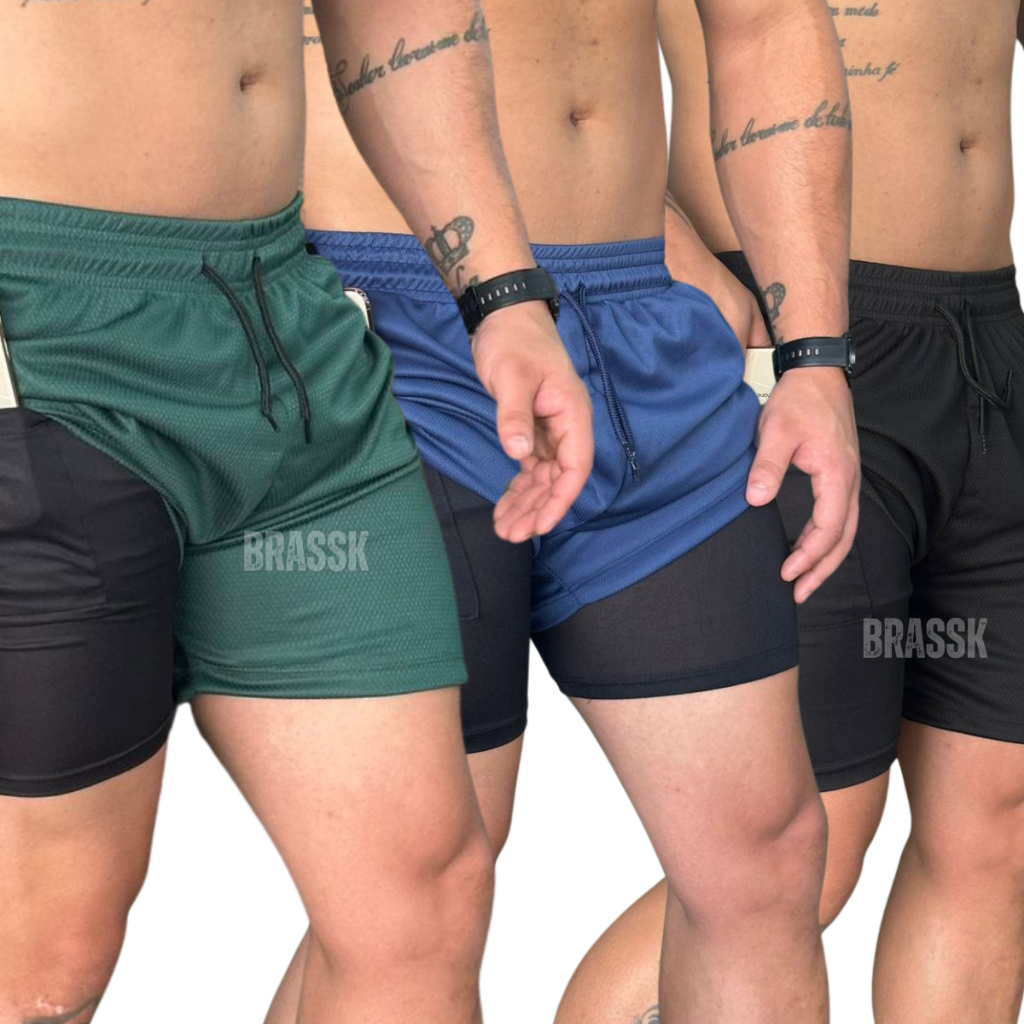 KIT 3 Short BRAS 2 em 1 Bermuda Elastano Academia Masculino Treino Corrida