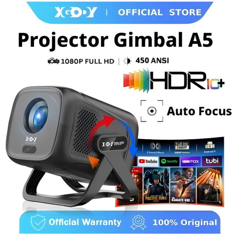 XGODY Gimbal A5 Projetor 1080P HD Doméstico Portátil Foco Automático Sistema YouTube/Netflix 4K Android 11.0 Integrado