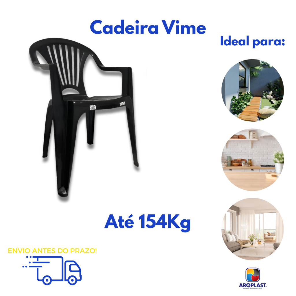 Cadeira Poltrona Preta Plastica Resistente Reforçada Suporta 154Kg Arqplast Para Jardim Bar Festa