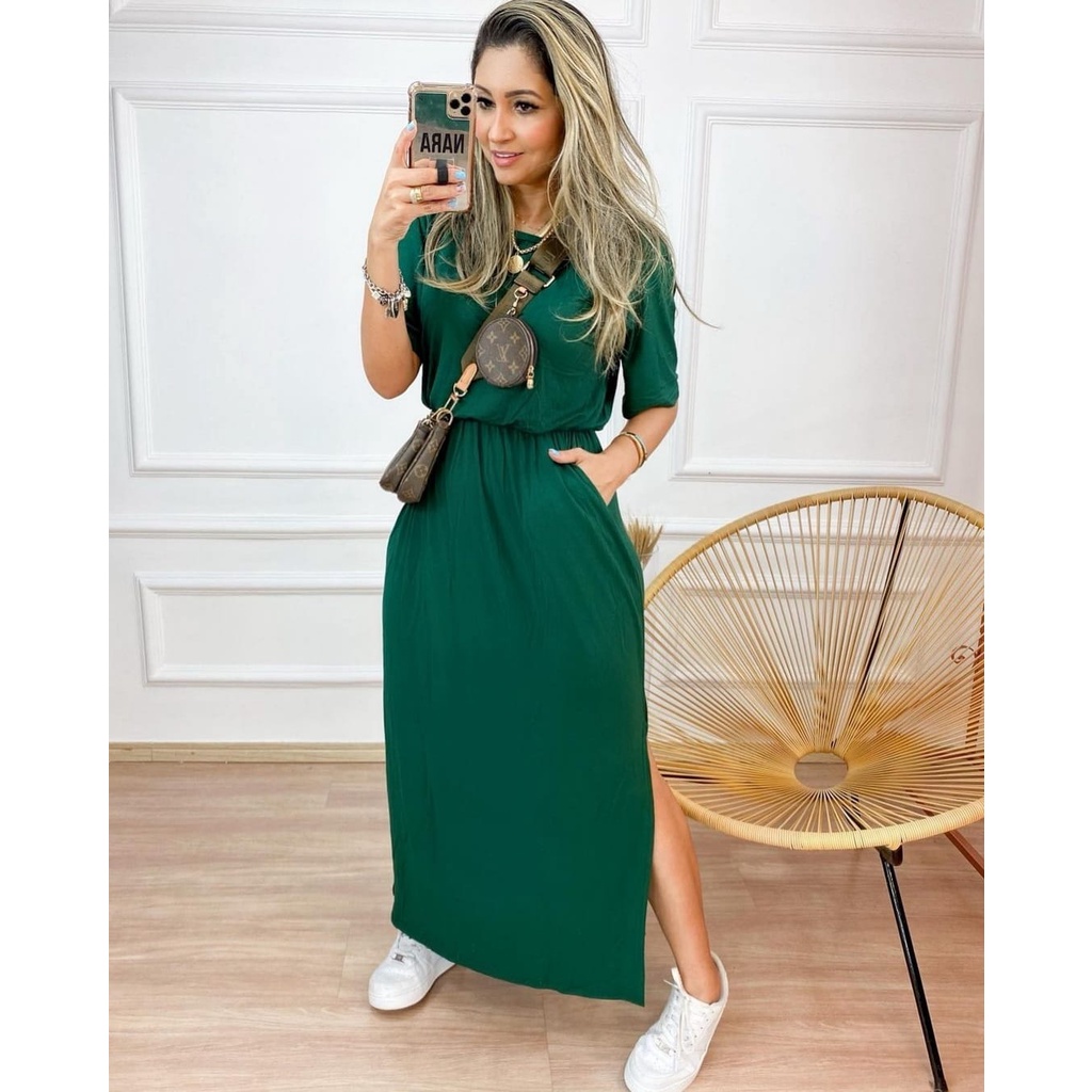 Vestido Feminino Alcinha Longo Com Decote e Abertura Lateral Moda Blogueira