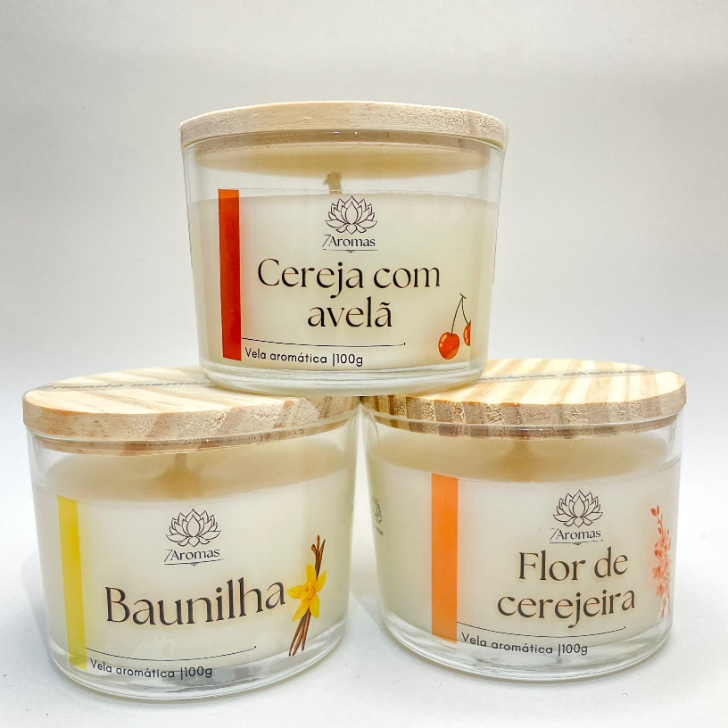 Kit 3 Velas Aromáticas Artesanais 100g - Cereja com avelã, Flor de cerejeira e Brisa do mar - Essência Premium