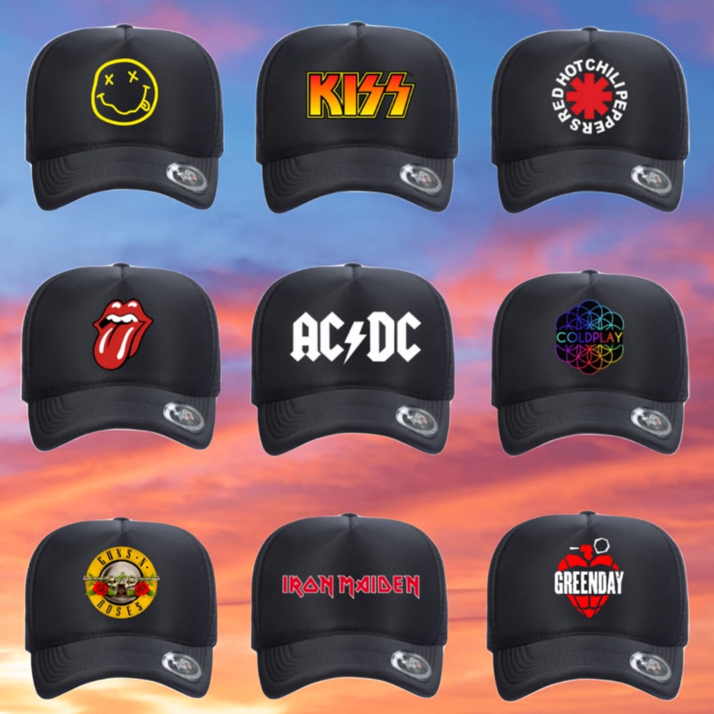 Boné de Rock Diversas Bandas - Boné Trucker Aba Curva Preto