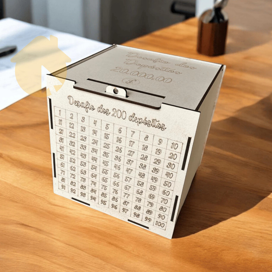 CAIXA DE 20 MIL DESAFIO DOS 100 DEPOSITOS EM MDF CRU. GUARDE 20 MIL REAIS COM ESTE COFRE COFRINHO PRESENTE LEMBRANCINHA COFRE DESAFIO JUNTE
