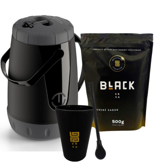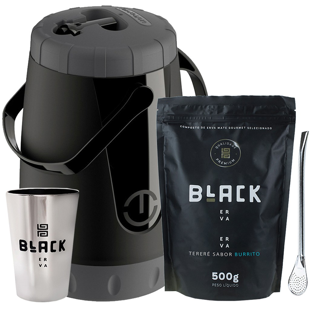 Kit Tereré Completo Garrafa Térmica 2,5L Erva Black 500g Copo Cuia E Bomba Pretas