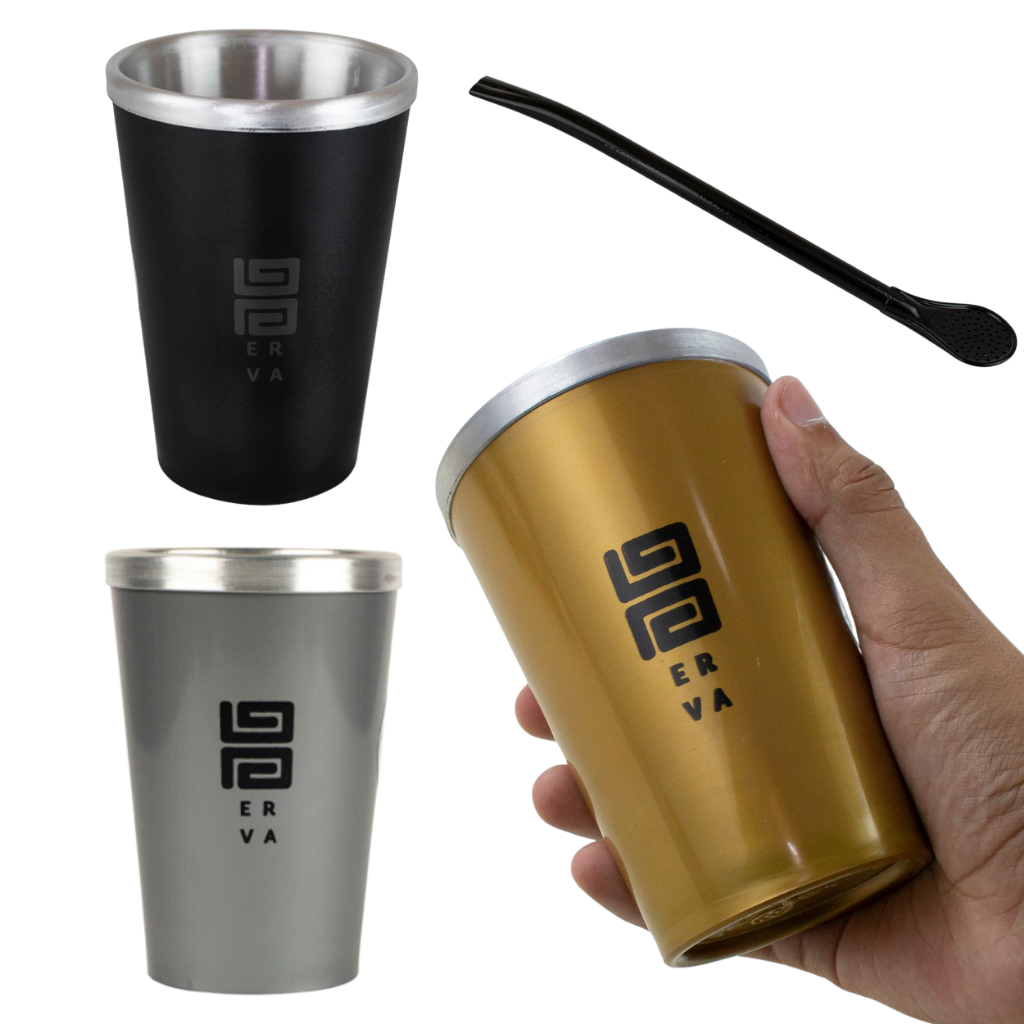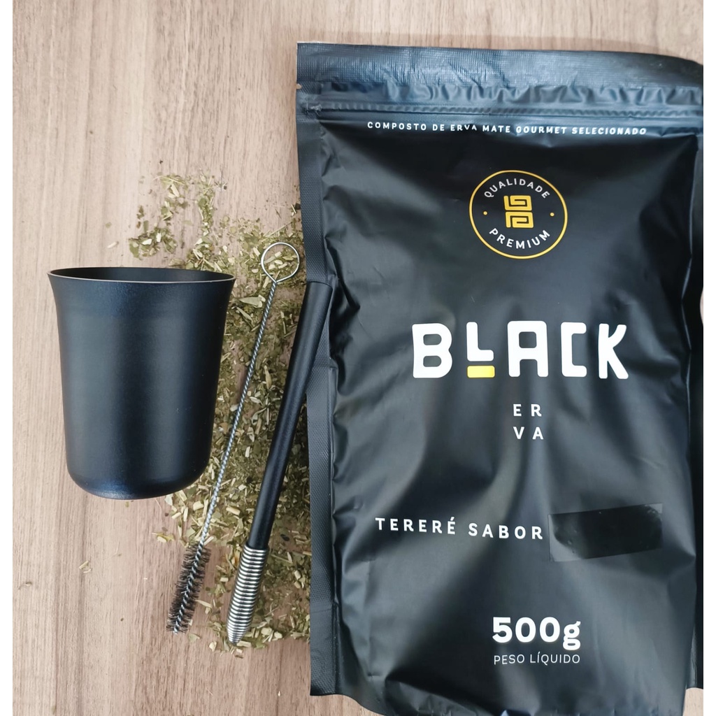 kit terere preto: copo cuia alumínio 250 ml + bomba inox desmontável de mola cônica + erva mate Black Erva pacote 500gramas 8 sabores disponíveis