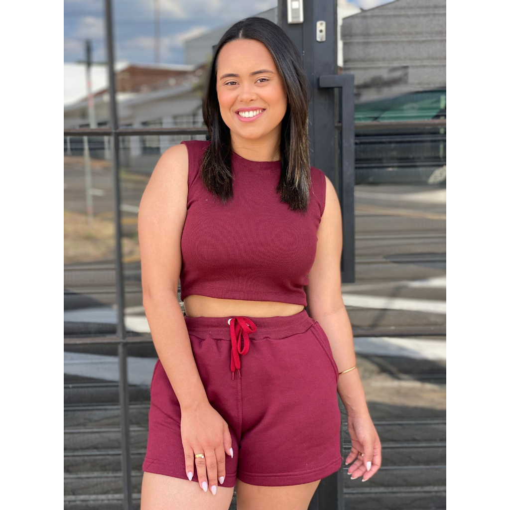 Conjunto Verão Viscolycra Short Cintura Média e Blusa Gola V Básica