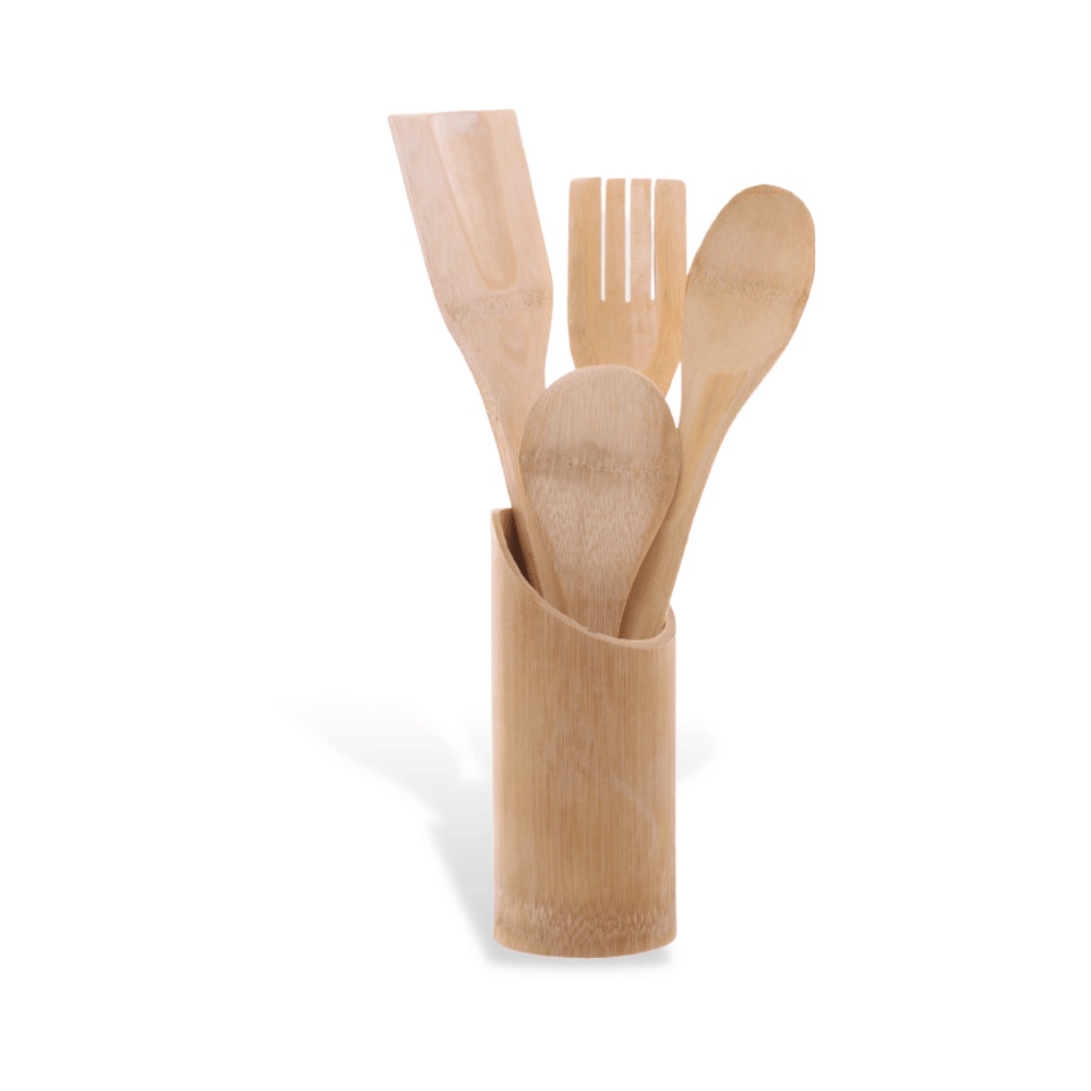 Kit De Cozinha Em Bambu Com 5 Peças- suporte, espátula, colher