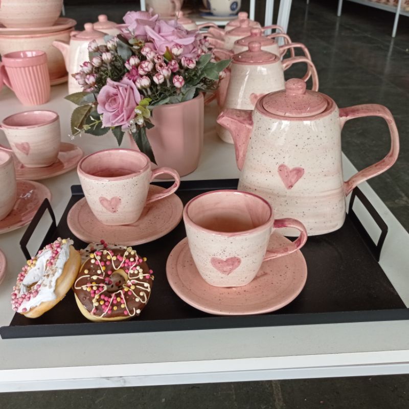 kit jogo xícara chá rosa 150 ml em cerâmica 6 un com bule 1.8 litro