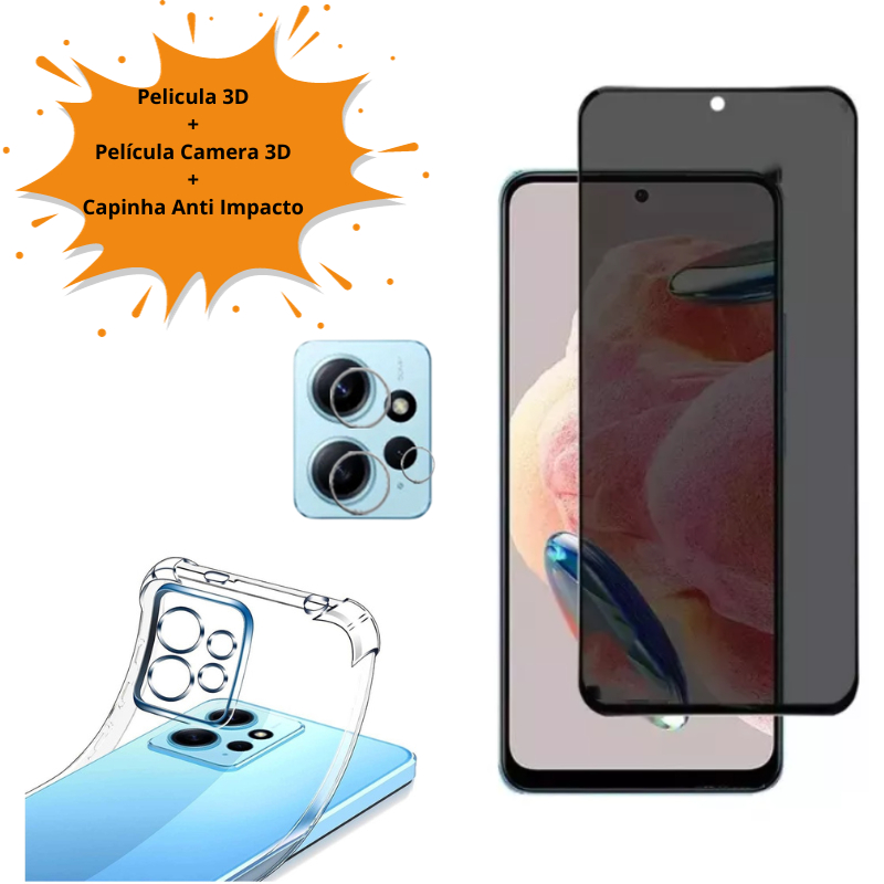 Kit Proteção Privacidade Xiaomi Redmi Note 12 | Película 3D Privacidade, Capinha Anti Impacto e Película 3D para Câmera