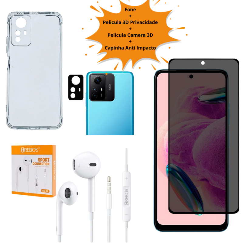 Kit Proteção Privacidade + Fone Stereo Xiaomi Note 12S | Película 3D Privacidade para Tela, Película 3D para Câmera, Capinha Anti Impacto e Fone de Ouvido Stereo