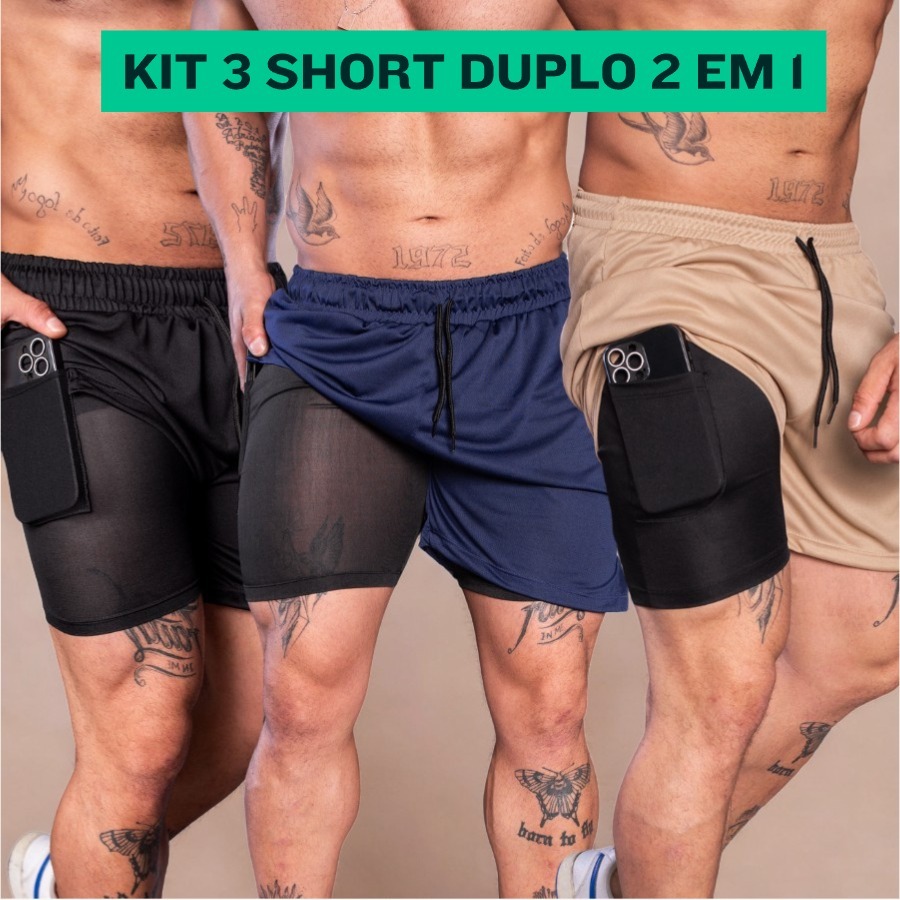 KIT 3 Bermuda Short 2 em 1 Dry Active Academia Masculina Treino Corrida Com Elastano