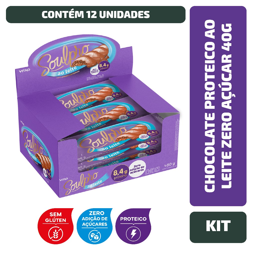 Kit Chocolate Proteico Ao Leite Zero Açúcar Soulpro 40G - 12 Unidades
