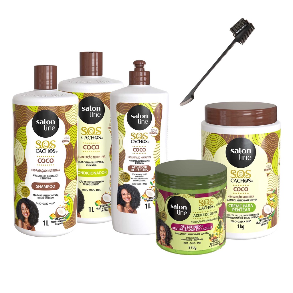 Kit SOS Cachos Coco Familia + Gel Definidor Azeite de Oliva + Pente Baby Hair Salon Line