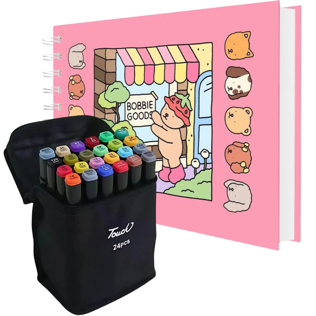 Kit livro de colorir Bobbie Goods + Conjunto de canetinhas touch ponta dupla - Capa Dura, Folhas 180g, com acetato