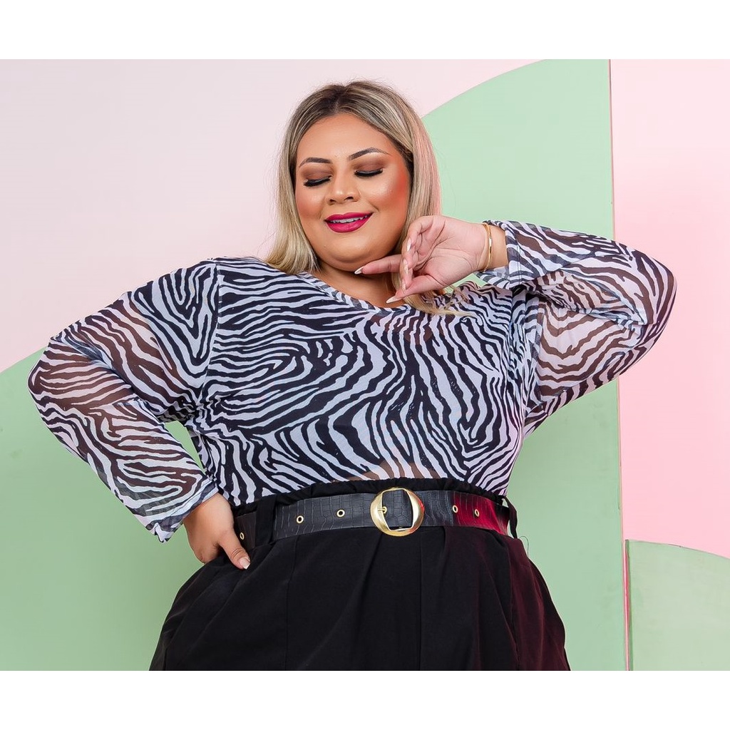 Blusa Plus Size 46 ao 58 de Tule Estampado Animal Print Zebra Paula Fernandes