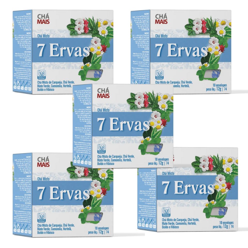 Kit 5 Chás 7 Ervas - Carqueja - Chá Verde - Mate Verde - Camomila - Hortelã - Boldo e Hibisco