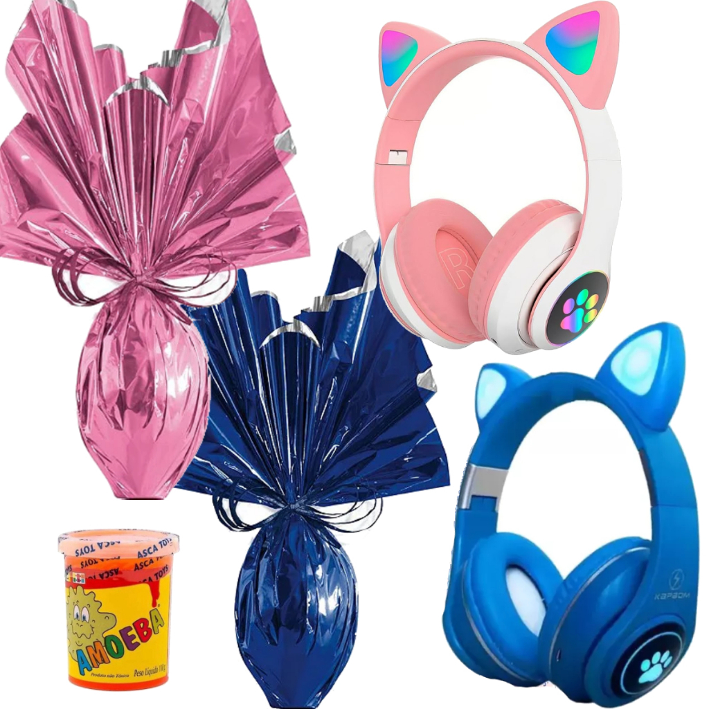 Kit Ovo de Páscoa Infantil 250 Gramas Ao Leite + Fone de Ouvido Gatinho Menino Menina Presente + Brinde