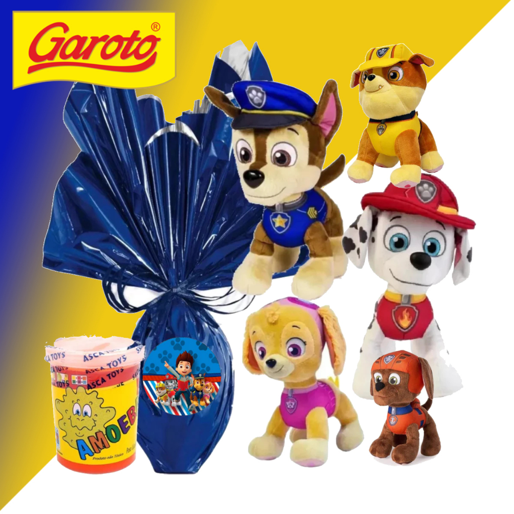 Kit Ovo de Páscoa Infantil 250 Gramas Ao Leite + Pelúcia Patrulha Canina Fofas 25cm Presente Todos Personagens + Brinde