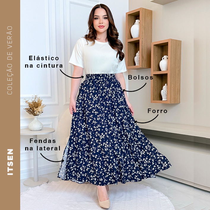 Saia Longa Estampada Floral com Forro, Fendas e Bolsos laterais com elástico na cintura | moda evangélica | VISCOLINHO
