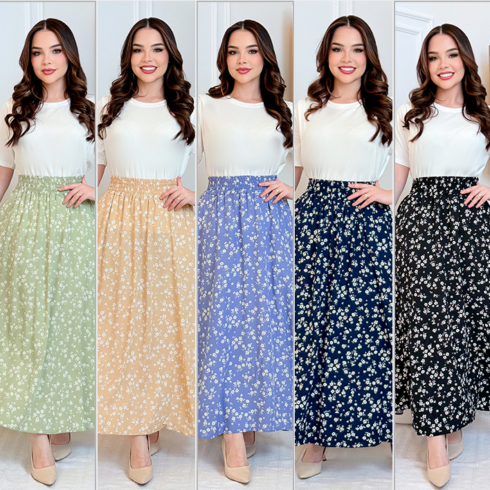 Saia Longa Estampada Floral com Forro, Fendas e Bolsos laterais com elástico na cintura | moda evangélica | viscolinho