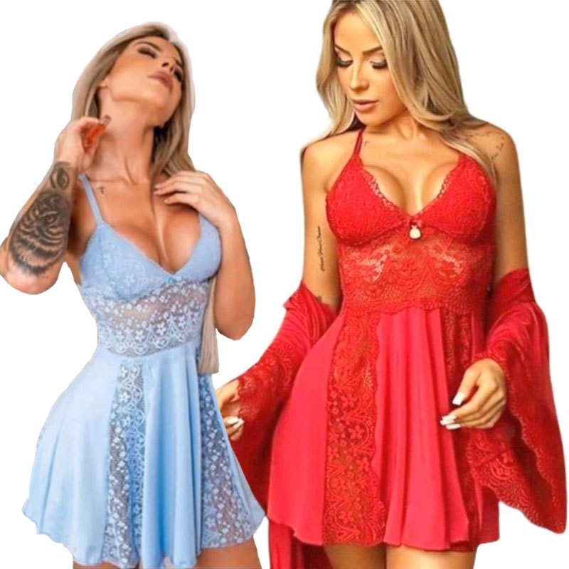 Camisola Renda Transparência Curta Lingerie com Calcinha Fio Sensual Pijama
