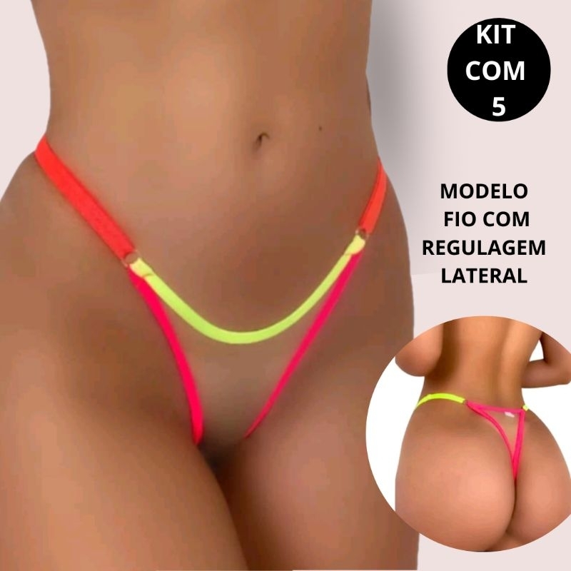 Kit 5 Tangas Fio Dental Neon Calcinha Bicolor Em Tule Com Regulagem Lateral Arco Iris Sexy Lingerie Feminina Ajustáveis String