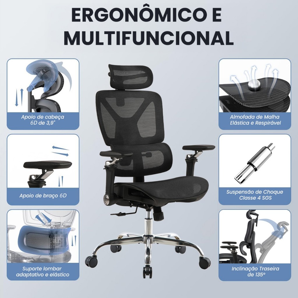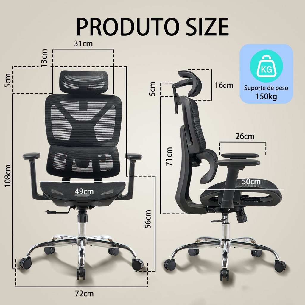 Cadeira Ergonômica Escritório Braços 6D Ajustável Apoio Lombar Confortável Tecido Respirável 150kg