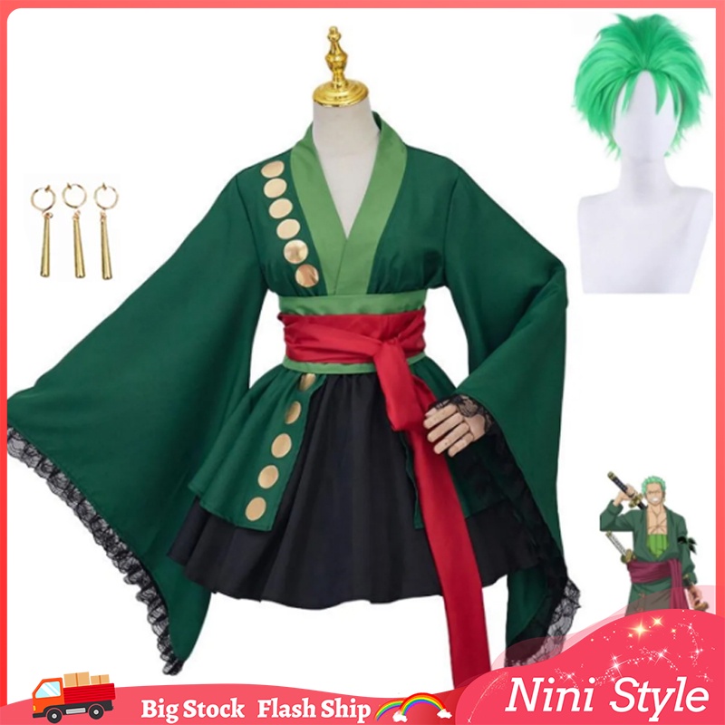 Anime Roronoa Zoro Cosplay Japonês Vestido Lolita Com Cinto Para Mulher Adulta De Kimono Saia Verde Homem Brincos De Peruca Festa Fato Uniforme Vestidos Femininos Oufits