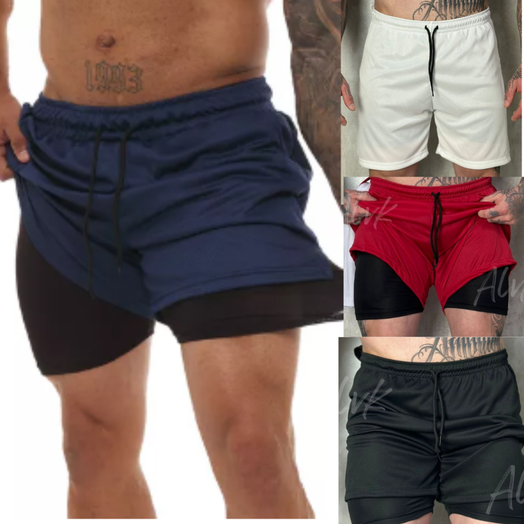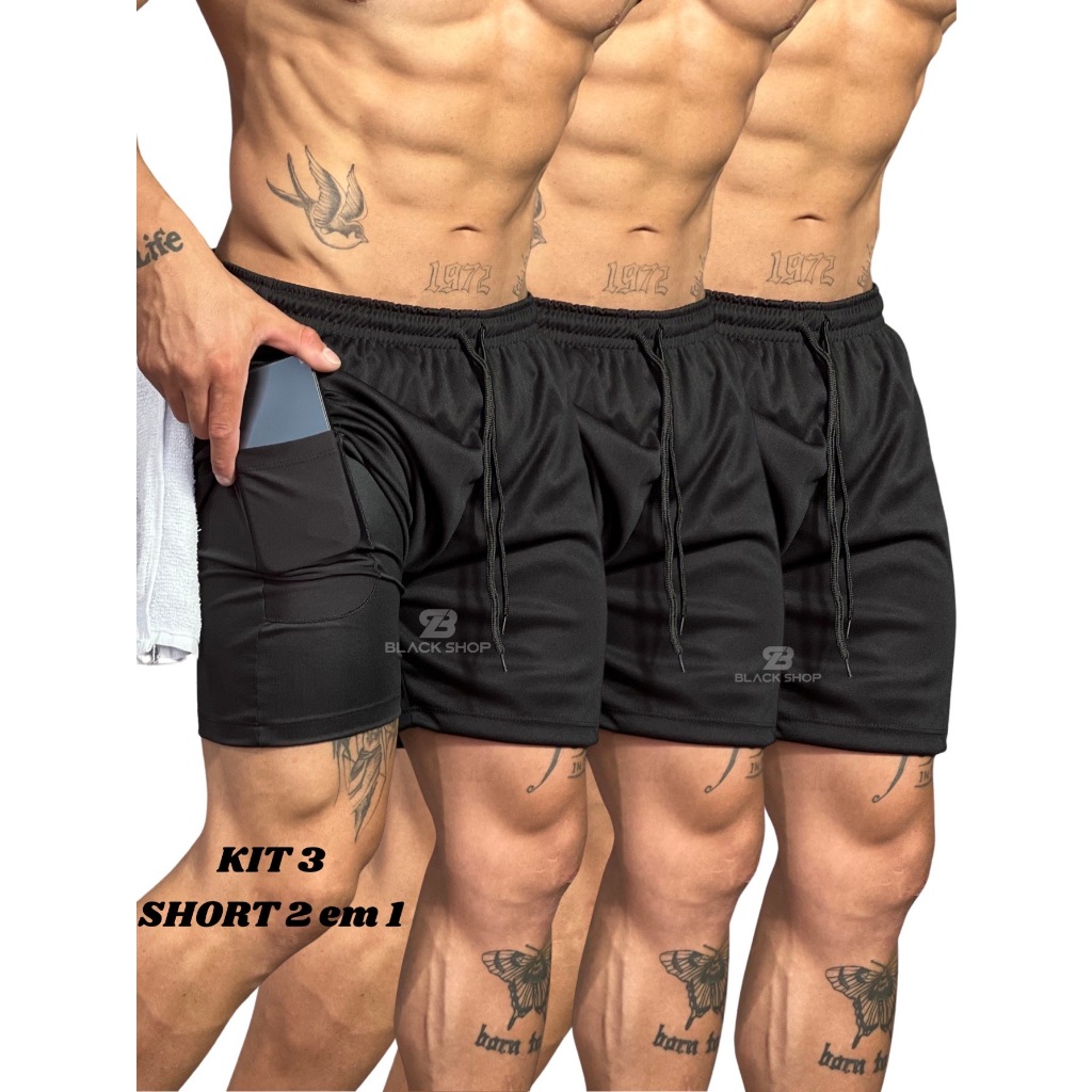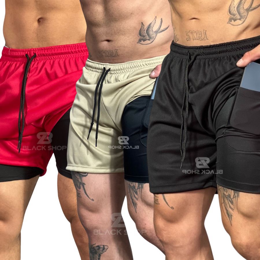 KIT 3 Bermuda Short 2 em 1 Academia Masculina Treino Corrida Com Elastano BRAS