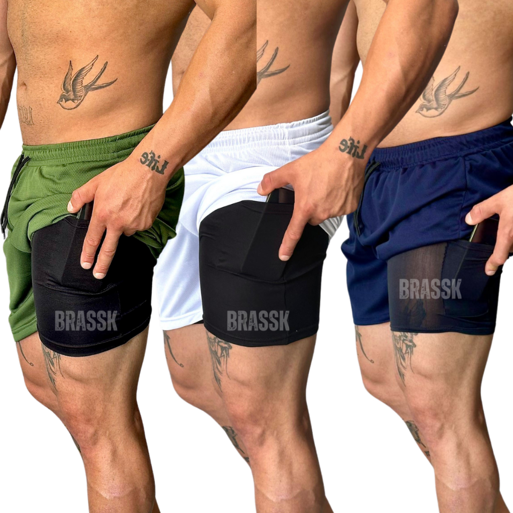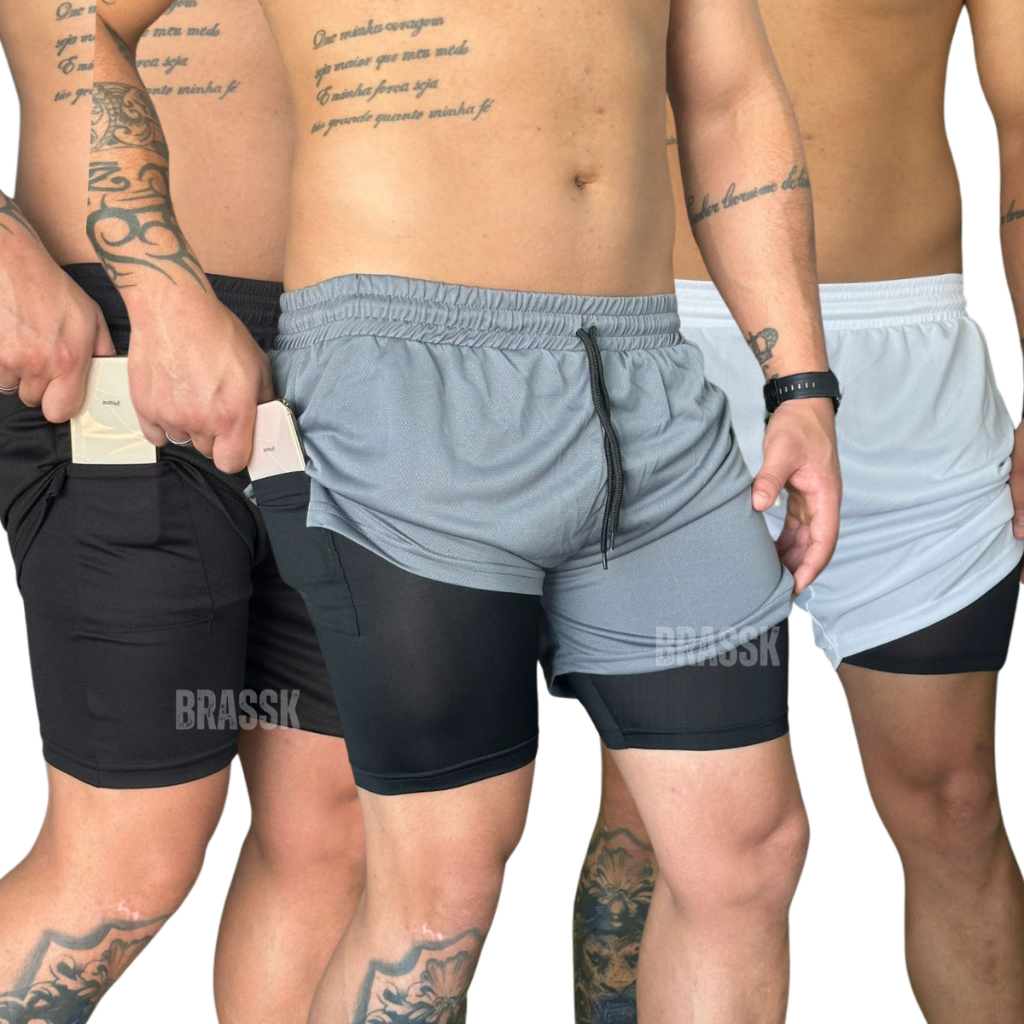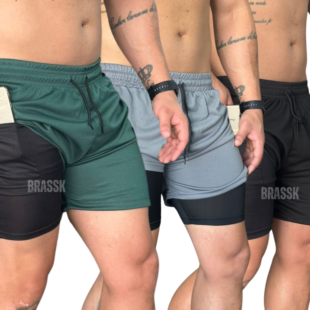 KIT 3 Bermuda Short 2 em 1 BRAS Academia Masculina Treino Corrida Com Elastano