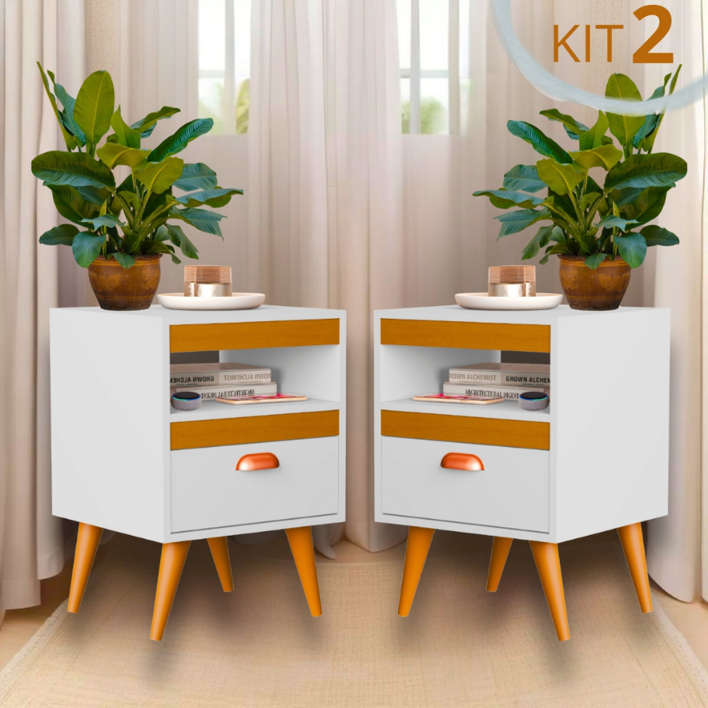 Jogo Quarto Kit 2 Mesa de Cabeceira Compacta Pés Estilo Retrô Mesinha com Gaveta Organizadora Puxador Concha Nicho Decoração Canto Lateral Apoio Aparador Objeto Cama Classic New - RPM
