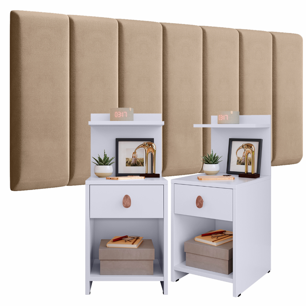 Cabeceira Módulo Retangular Painel Acolchoado Box Casal 1,40 Kit 2 Mesinhas com Gaveta Mesa Apoio Cama Nicho Suporte Objeto Quarto Completo - RPM
