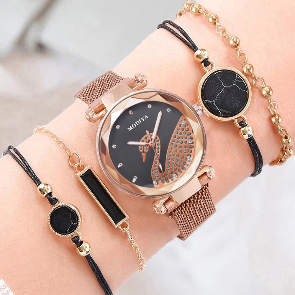 Conjunto De 5pcs Relógio Pulseira Feminina Elegante Casual De Quartzo Feminino De Cisne Rhinestone