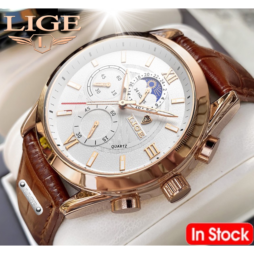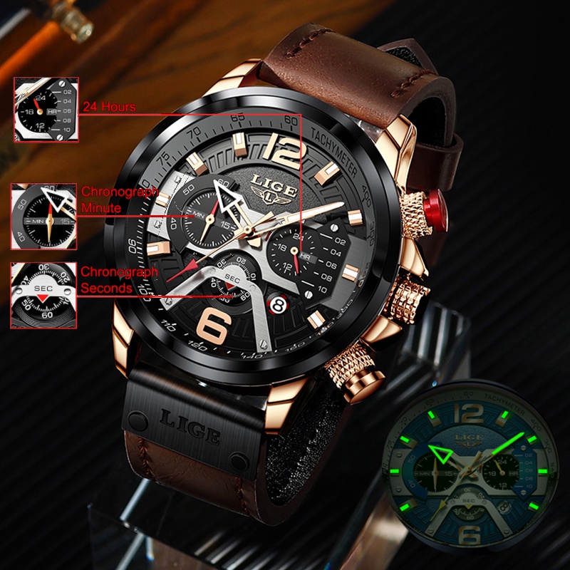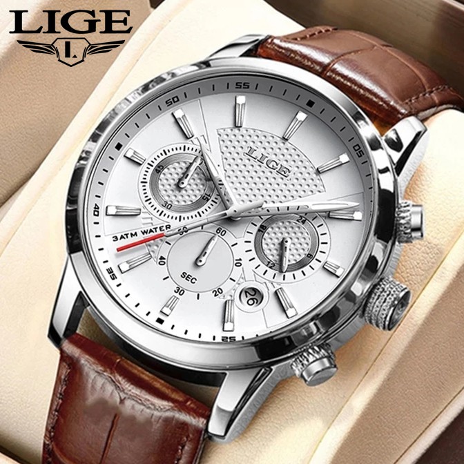 LIGE negócio original relógio masculino moda casual pulseira de couro à prova d'água cronógrafo luminoso relógio de pulso de quartzo analógico