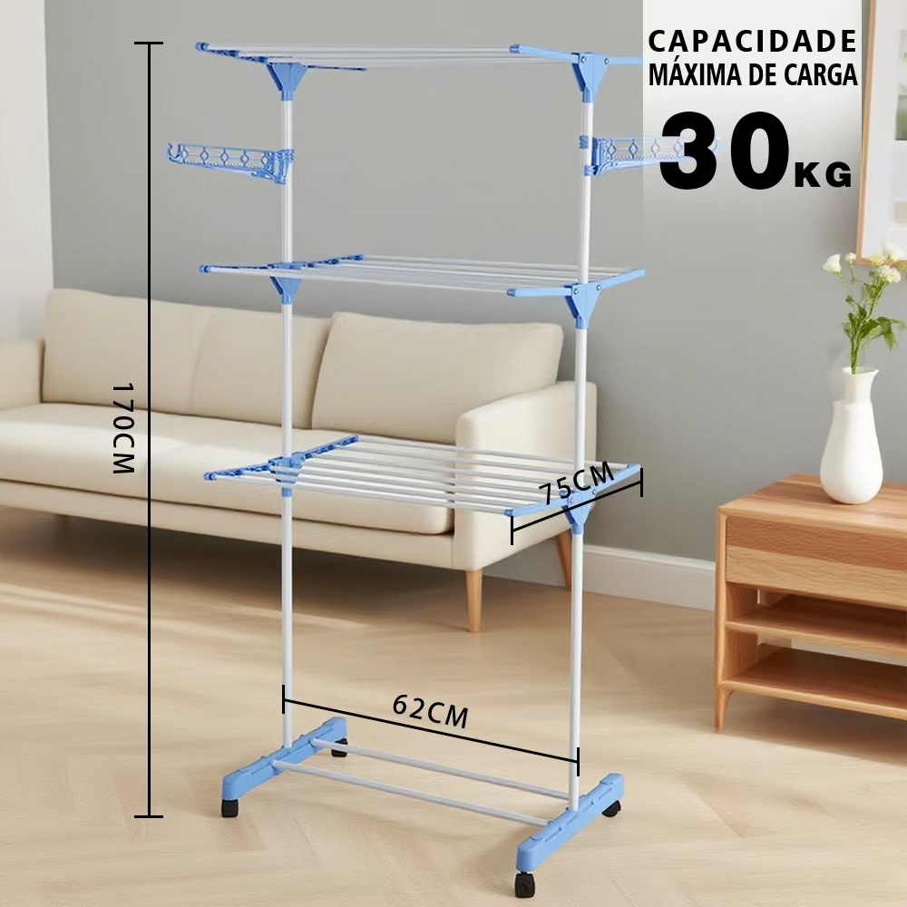 Varal De Chão Dobrável com Rodinhas 3 Prateleiras Sapateira e Abas Para Cabides Até 30 Kg
