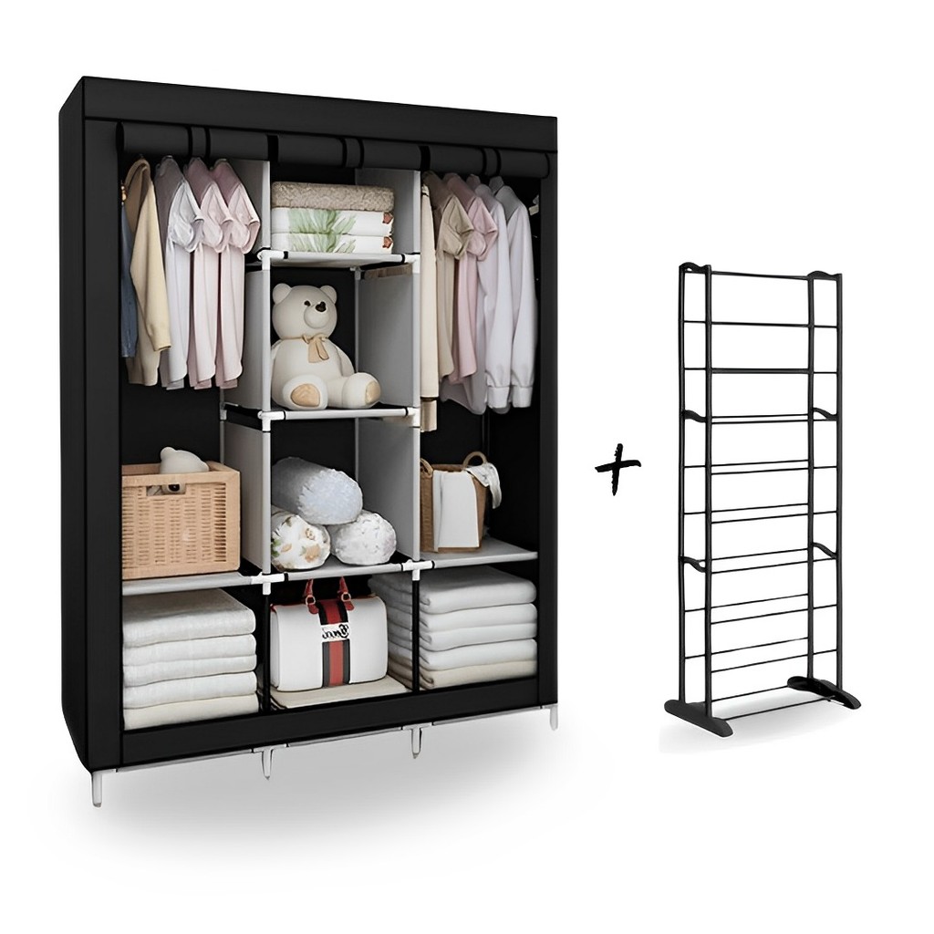 Kit Guarda-Roupa Portátil Dobrável com Prateleiras e Zíper + Sapateira Vertical 30 Pares, Organizador de Roupas e Sapato