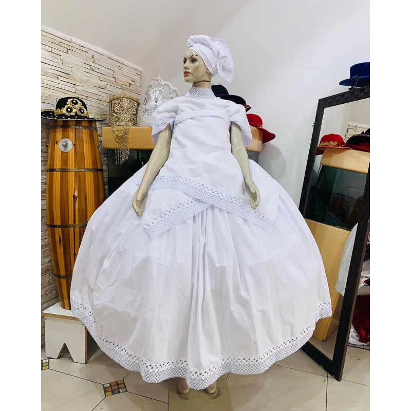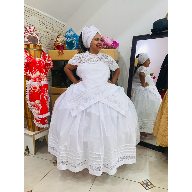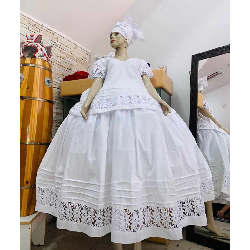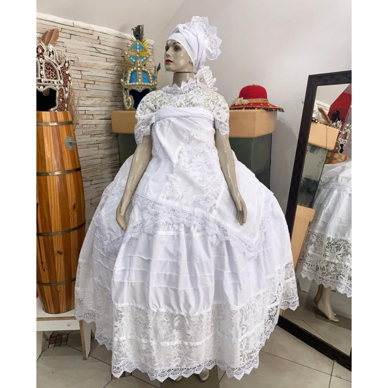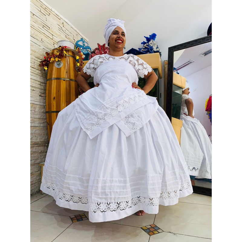Roupa conjunto baiana em renda 3 babados branca umbanda candomble BATA E SAIA