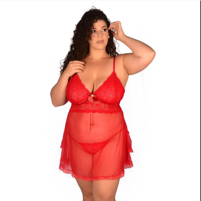 Camisola curta plus size sensual com transparência e detalhes 2356 de renda luxo acompanha calcinha fio dental