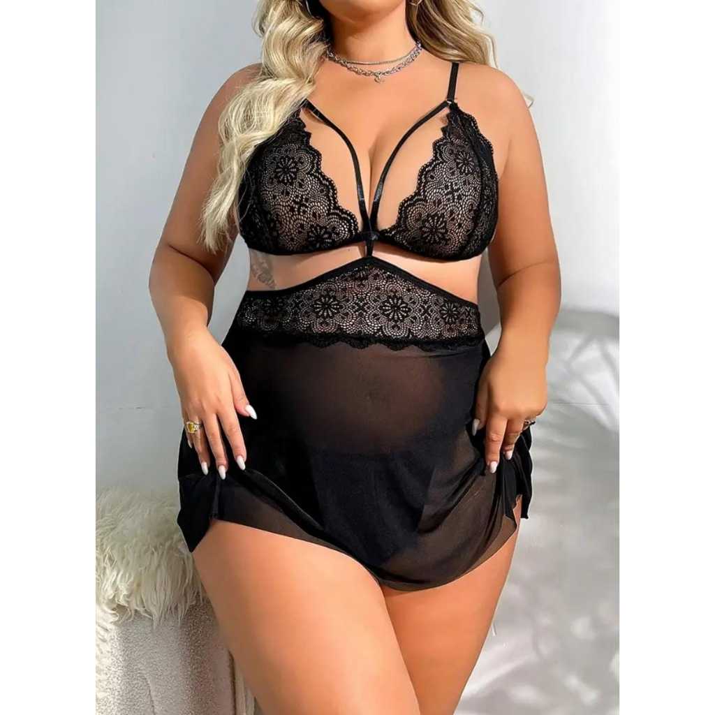 Camisola Plus Size Renda e Tule Com Calcinha Sensual
