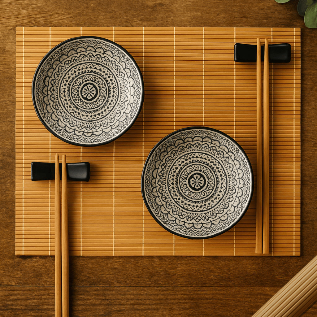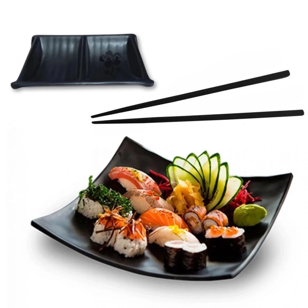 Kit Jantar para Comida Japonesa 1 Prato Côncavo + 1 Hashi + 1 Molheira Preta