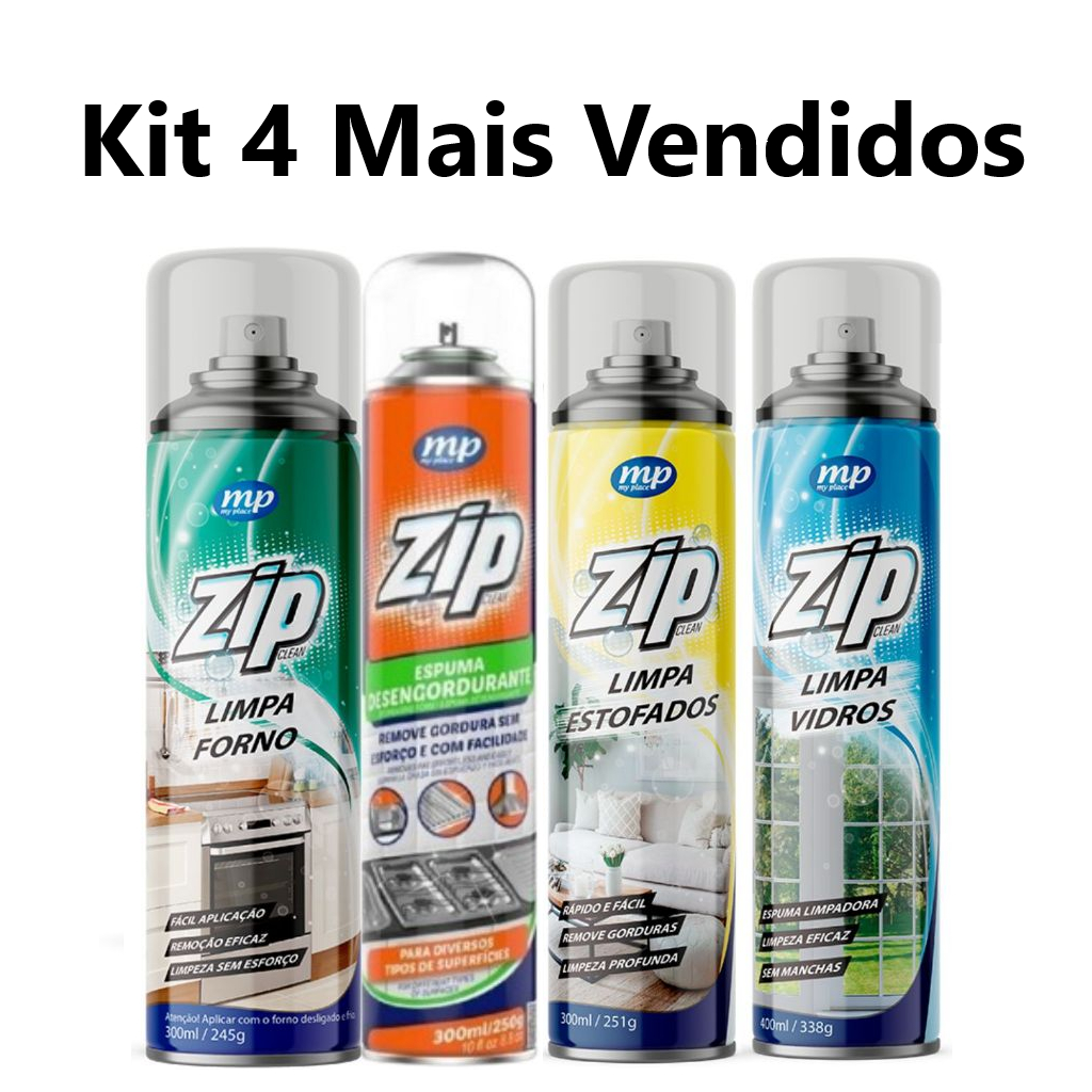 Kit 4 Produtos Mais Vendidos Zip Clean Espuma de Limpeza Desengordurante Vidros Fornos e Estofados