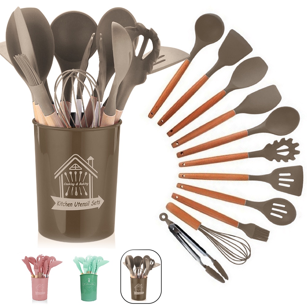 Kit 12 Peças Utensílios Cozinha Em Silicone Maciço E Cabos De Madeira Colheres Linha Master Cheff