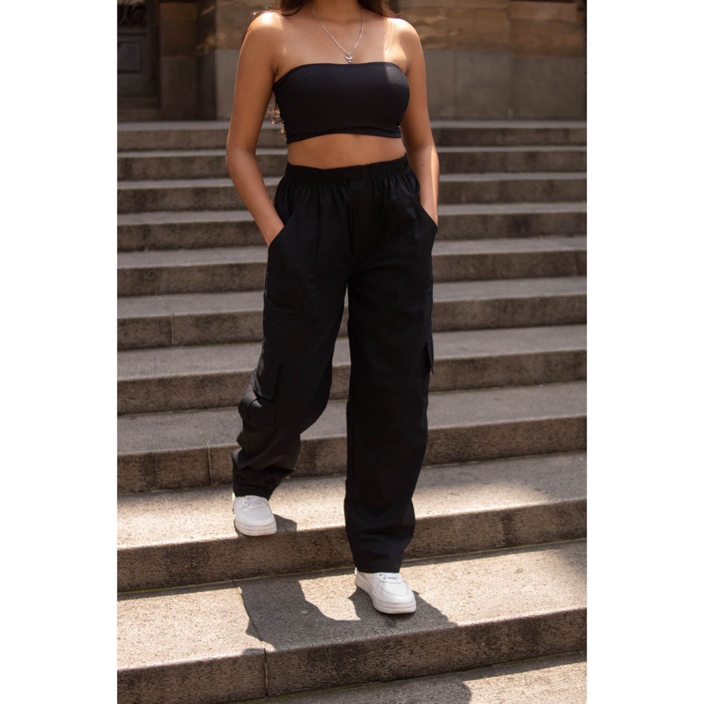 CALÇA CARGO JEANS COM ELASTICO E CORDÃO NA CINTURA 6 BOLSOS