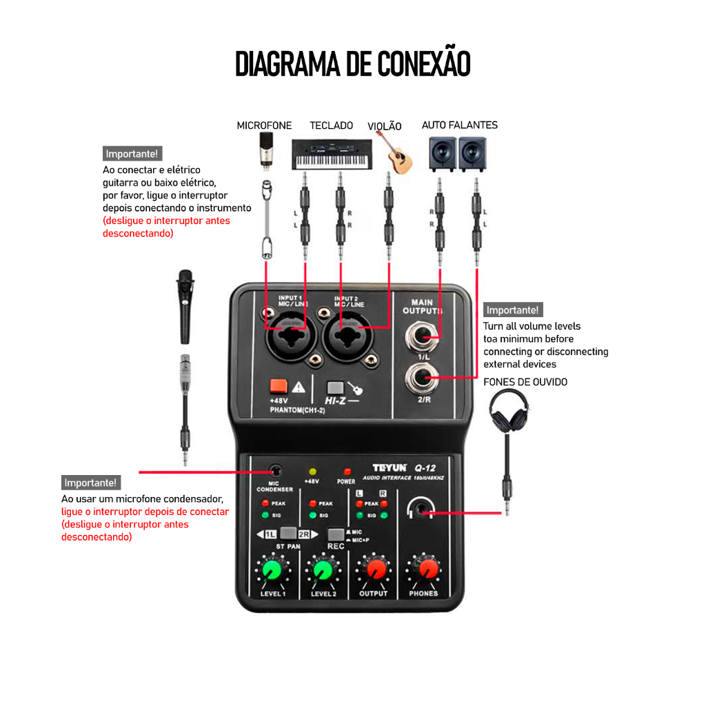 Interface de áudio portátil Teyun Professional Mini USB externa placa de som Mixer 48V Computador Guitarra Estúdio PC Gravação Q-12