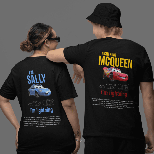 Kit Camiseta Casal McQueen e Sally Bege Carros Cars - Oversized Babylook A4 Camisa Blusa Carro Automotiva Dia dos namorados