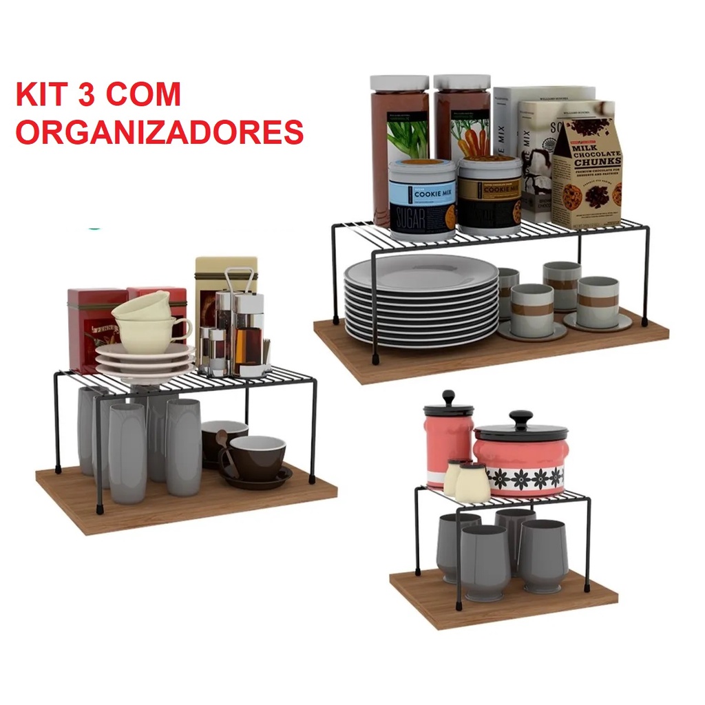 KIT 3 Organizador Suporte de Armário Cozinha Prateleira Pratos Copos Aramado Preto